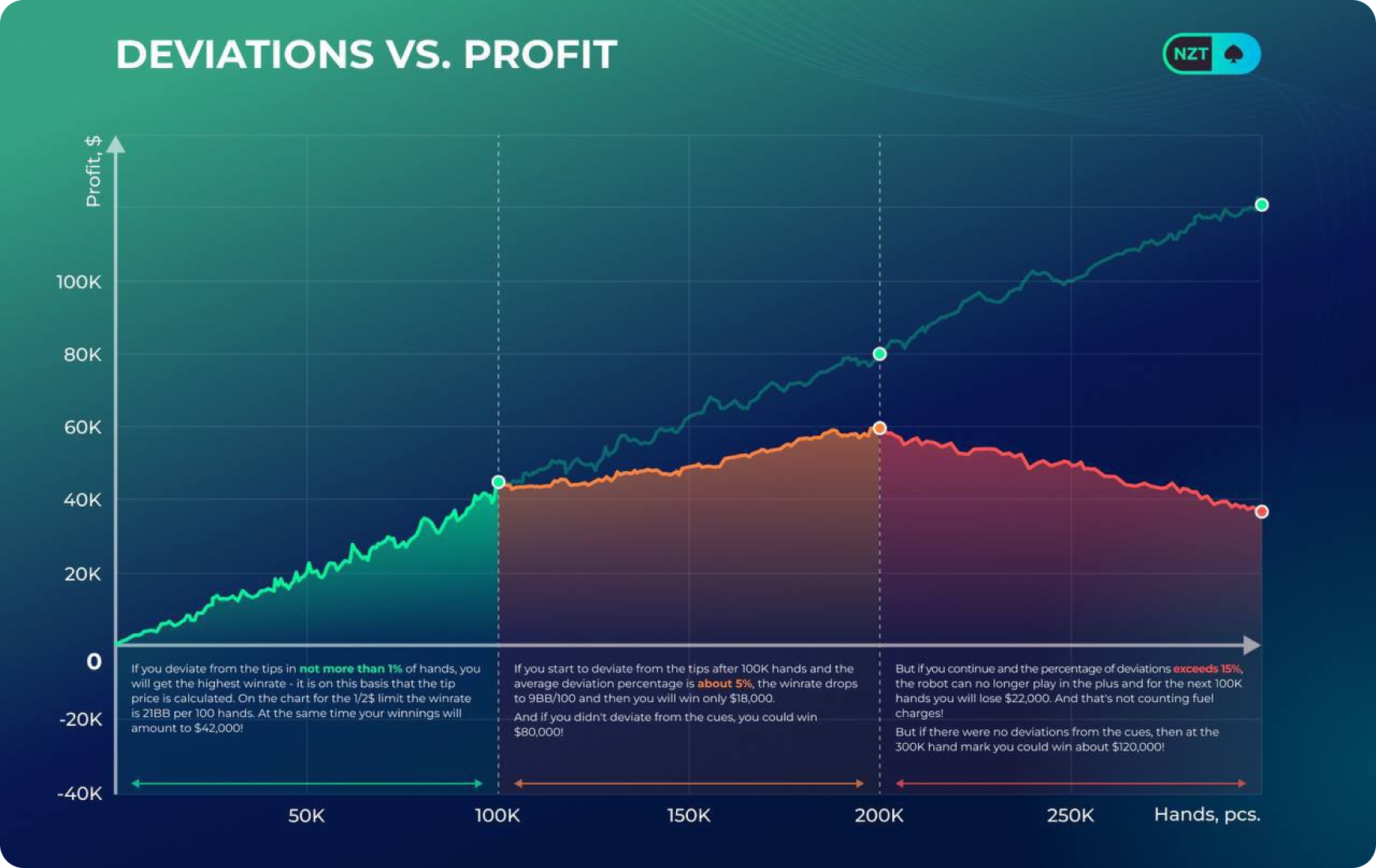 성공은 고객님의 꾸준함과 실시간 힌트를 얼마나 잘 따르느냐에 따라 달라집니다. 포커용 AI는 100핸드당 약 10BB의 기대값을 제공하여 NZT를 강력한 도구로 만들어 줍니다. 규칙적으로 플레이한다면 리스크는 줄고 장기적인 수익은 꾸준히 증가하는 방향으로 나아갑니다.